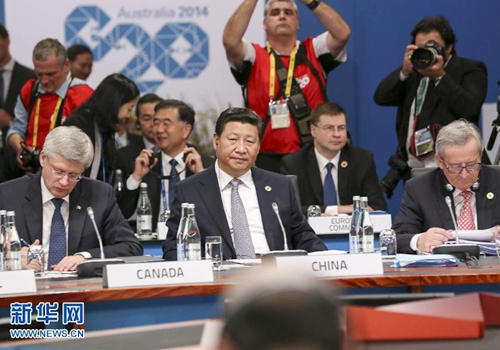 2014年11月15日,二十國集團(tuán)領(lǐng)導(dǎo)人第九次峰會(huì)在澳大利亞布里斯班舉行。國家主席習(xí)近平出席會(huì)議并發(fā)表題為《推動(dòng)創(chuàng)新發(fā)展 實(shí)現(xiàn)聯(lián)動(dòng)增長》的重要講話。新華社發(fā)