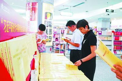 為配合“不忘初心、牢記使命”主題教育,北京圖書大廈專門設(shè)立《習(xí)近平新時代中國特色社會主義思想學(xué)習(xí)綱要》圖書專臺,連日來深受讀者喜愛。圖為7月25日,讀者正在認(rèn)真閱讀《習(xí)近平新時代中國特色社會主義思想學(xué)習(xí)綱要》一書。本報記者 閆匯芳攝/光明圖片