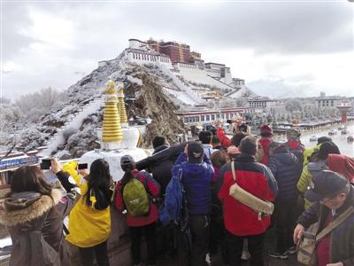 3月30日凌晨的一場雪把拉薩裝扮得銀裝素裹,圖為大批游客在布達拉宮觀景臺上拍攝布宮雪景。洛桑 攝