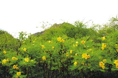 株高一兩米的大花黃牡丹掩映在一片片野生灌木叢中,一點點吸收陽光雨露再綻放出花朵。在片片綠葉的“呵護”下,大花黃牡丹有的嬌羞待放,有的則花瓣重重疊疊,在陽光下傲然吐露花蕊。