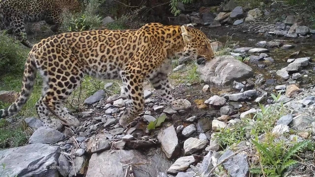 四川省新龍縣野外紅外相機拍到母金錢豹帶崽影像