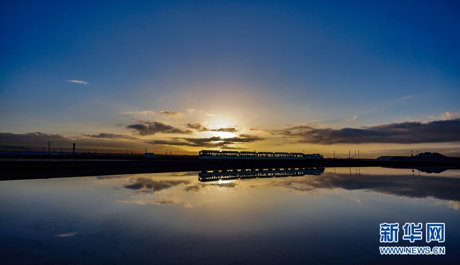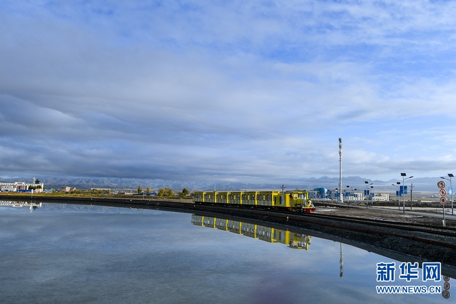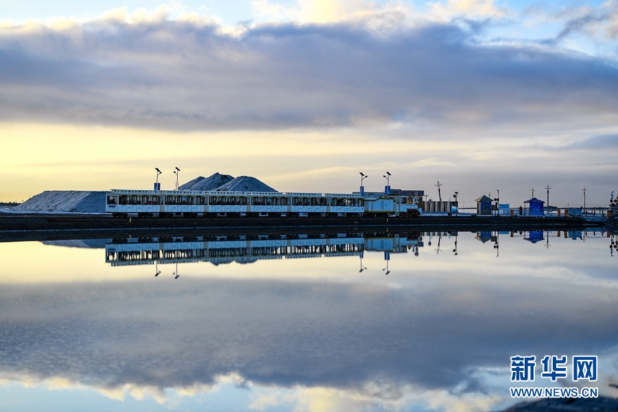 靜謐的早晨,觀光小火車緩緩行駛在茶卡鹽湖景區(qū)。新華網(wǎng) 潘彬彬攝