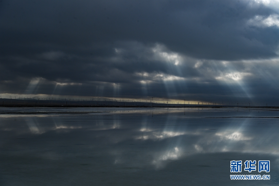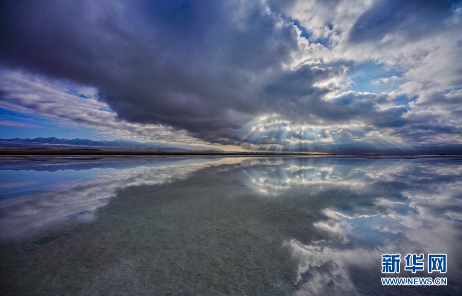 一縷縷金色的陽光透過云層的間隙,照射在干凈的湖泊上,形成茶卡鹽湖獨特的美。新華網(wǎng)發(fā)(宋忠勇攝)