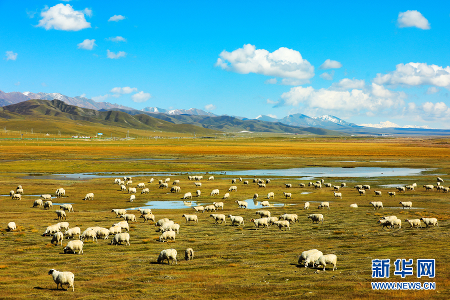 藍天白云之下,羊群悠閑自在地吃著草,與草原相映成趣。新華網(wǎng) 蘇金元攝