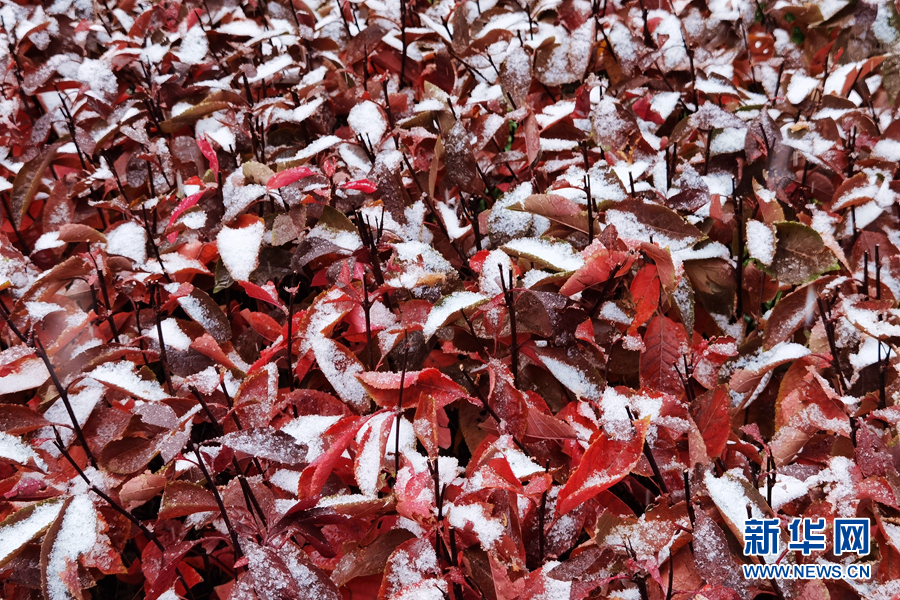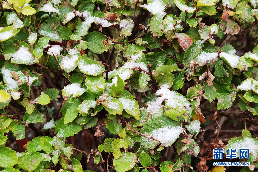 晶瑩的雪花落在樹(shù)葉上。新華網(wǎng)發(fā)(張海東攝)