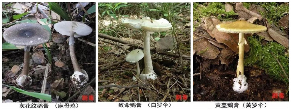 圖為劇毒鵝膏菌中的部分成員 圖片來源:云南省衛(wèi)生健康委員會、云南省疾病預(yù)防控制中心發(fā)布海報截圖拼接