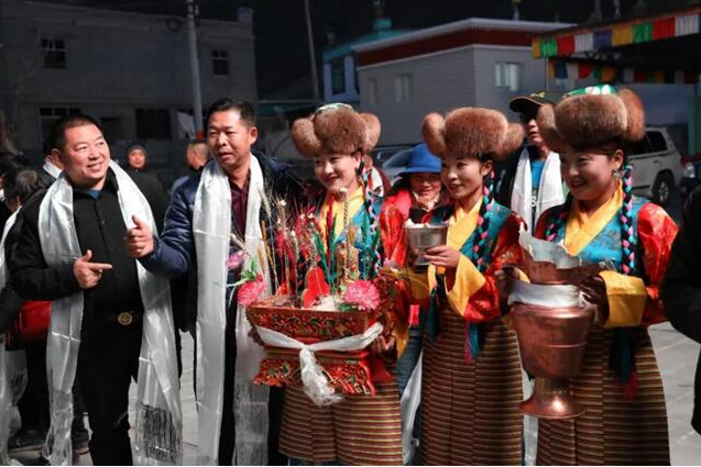 首發(fā)團(tuán)一到達(dá)歡迎儀式現(xiàn)場(chǎng),藏族同胞便端出裝滿糌粑、寓意圓滿如意的切瑪盒迎接游客,大家一起為游客獻(xiàn)上潔白的哈達(dá),并送上真摯的祝?!霸鞯吕铡薄T餮┌筒貞蛱饋?lái),青稞酒喝起來(lái),山南人民的熱情好客讓現(xiàn)場(chǎng)所有游客驚喜連連,感受到了滿滿儀式感。