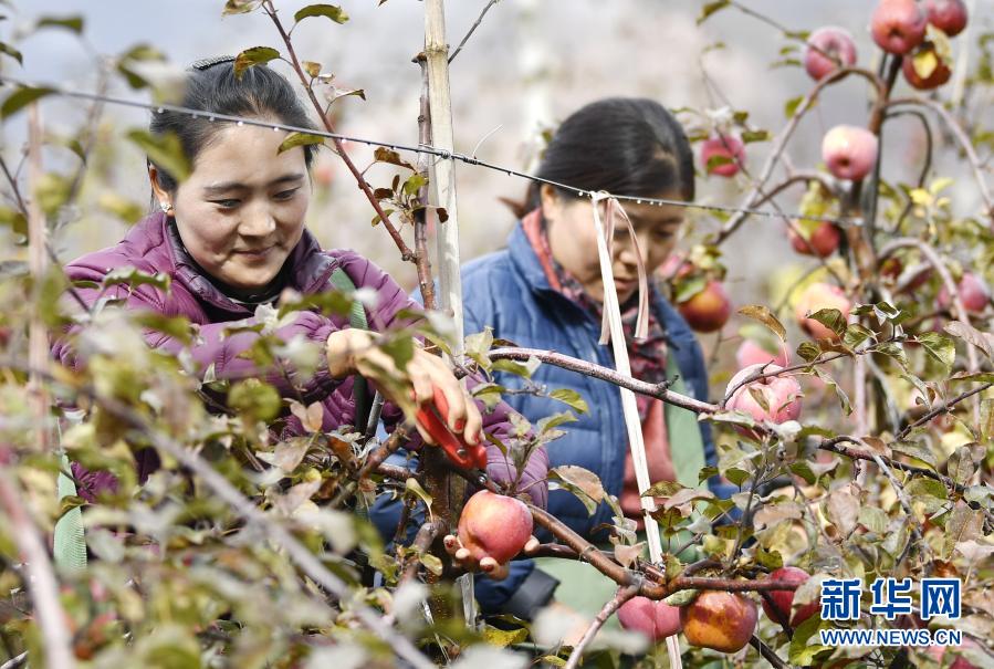 在林芝市米林縣羌納鄉(xiāng)西藏林芝現(xiàn)代蘋果標(biāo)準(zhǔn)化園區(qū),務(wù)工人員在采摘蘋果(11月22日攝)。新華社記者 張汝鋒 攝