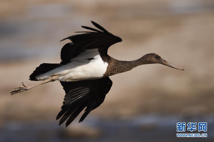 12月6日,一只黑鸛在西寧市北川河濕地公園上空飛翔。新華社記者 吳剛 攝