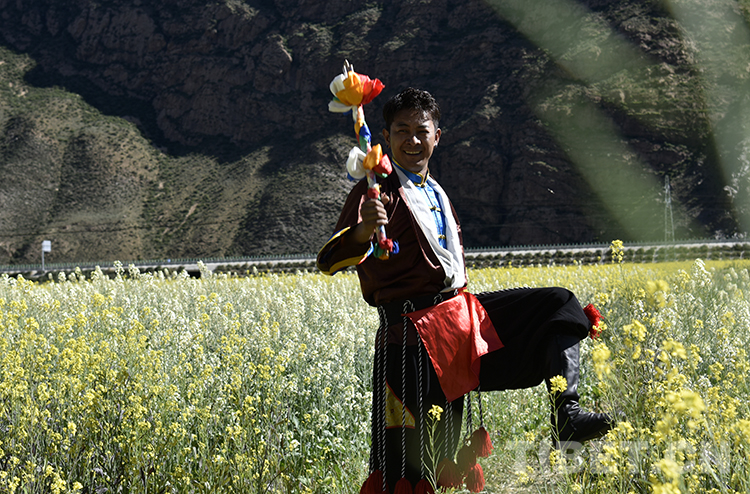 圖為墨竹工卡縣松贊文化旅游節(jié)暨第五屆油菜花節(jié)開(kāi)幕式前,舞蹈演員在油菜花田中留影 攝影:王媛媛