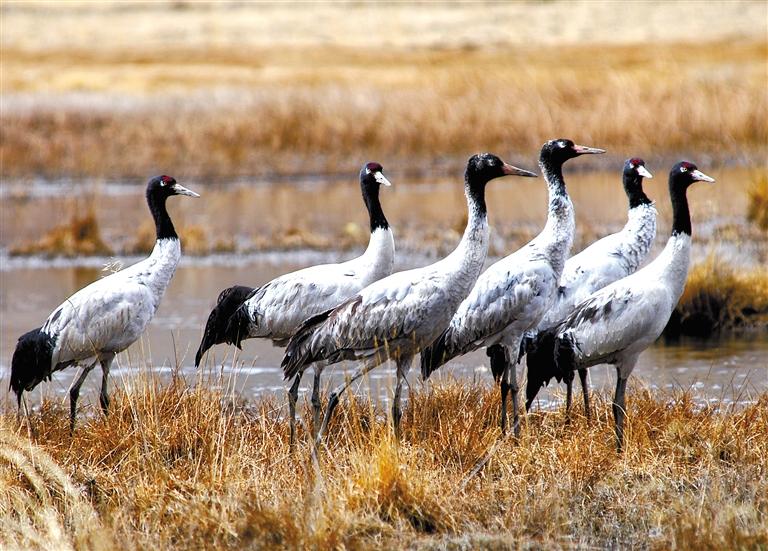 林周縣卡孜水庫附近覓食的黑頸鶴?! ?/p>