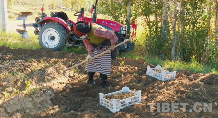 圖為唐嘎鄉(xiāng)窮達村村民在自家菜地里收土豆