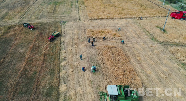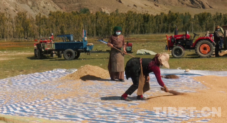 在達孜區(qū)雪鄉(xiāng)扎西崗村,隨著機器轟鳴,一顆顆金色飽滿的青稞粒構(gòu)成一扇彩虹門,有人在曬青稞、有人在裝袋、有人在搬運,一幅和諧的秋收圖展現(xiàn)在眼前?! ?/p>