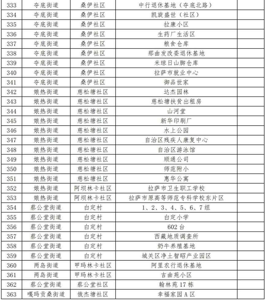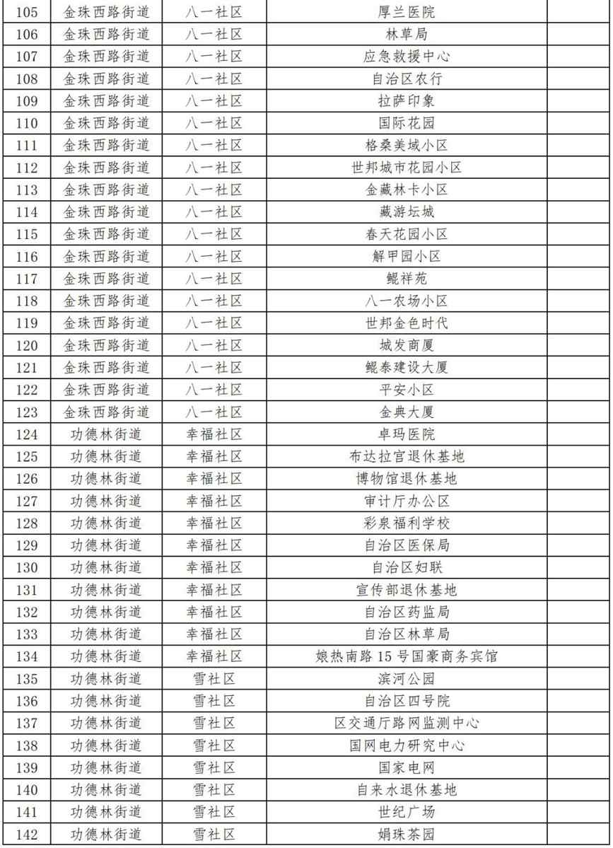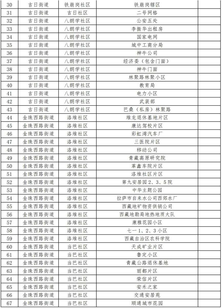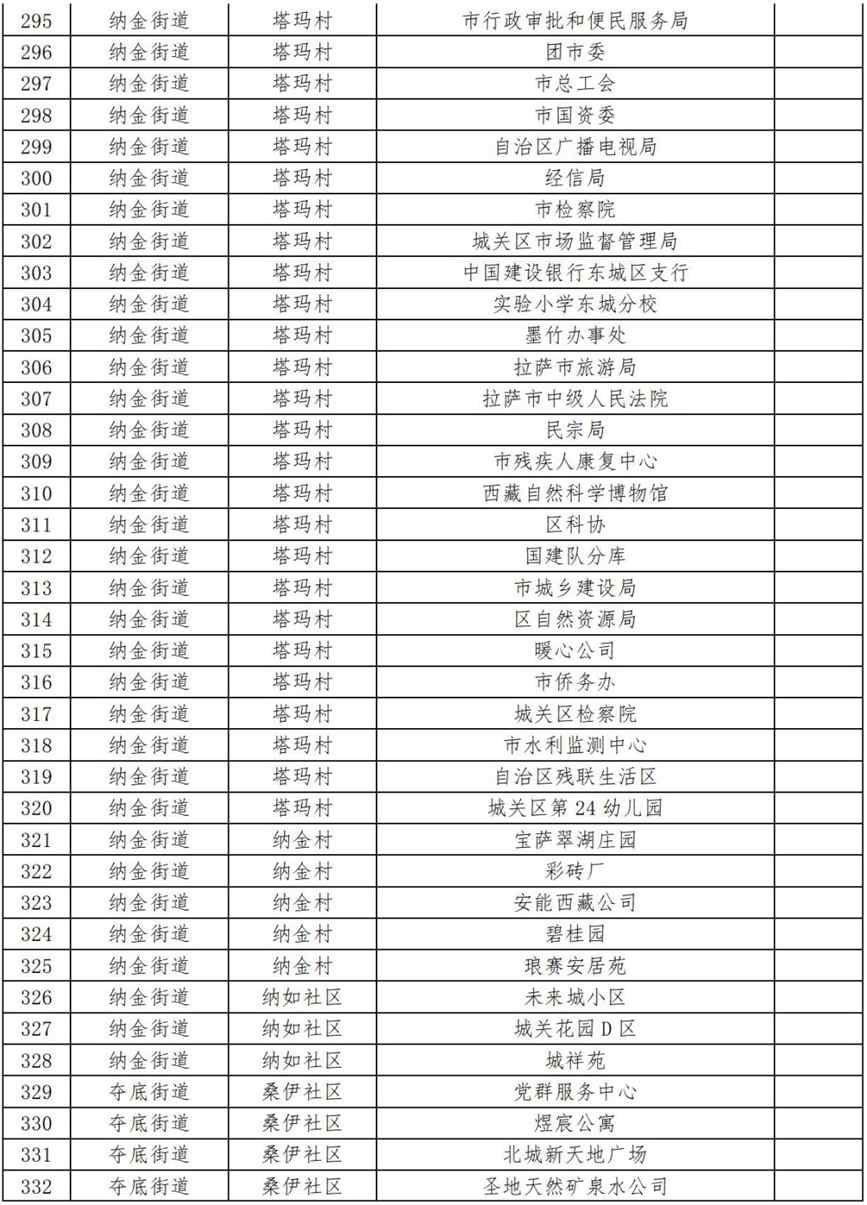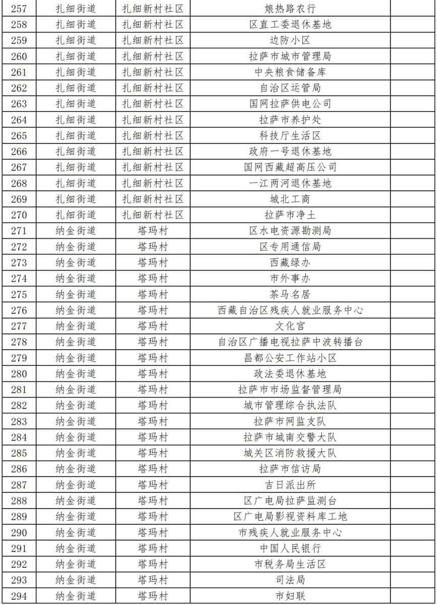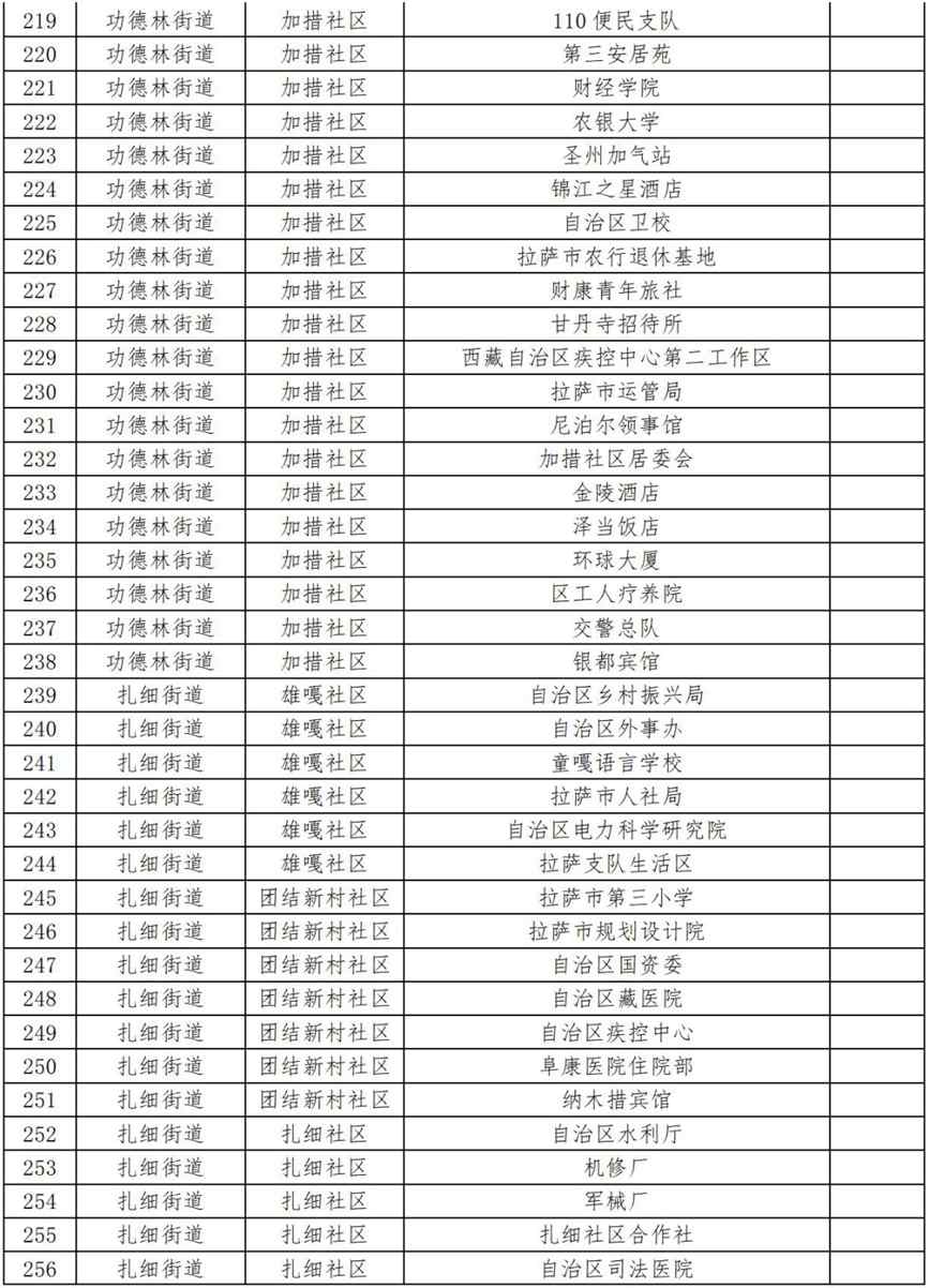 19.扎細街道團結新村社區(qū)(拉薩市第三小學、拉薩市規(guī)劃設計院、自治區(qū)國資委、自治區(qū)藏醫(yī)院、自治區(qū)疾控中心、阜康醫(yī)院住院部、納木措賓館);