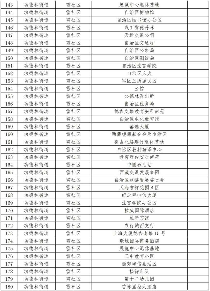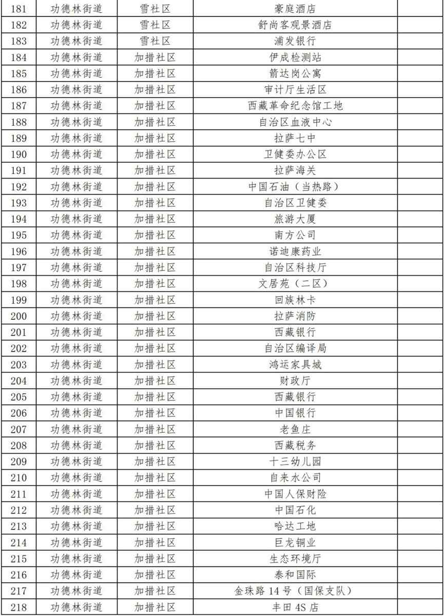 17.功德林街道加措社區(qū)(伊成檢測站、箭達崗公寓、審計廳生活區(qū)、西藏革命紀念館工地、自治區(qū)血液中心、拉薩七中、衛(wèi)健委辦公區(qū)、拉薩海關、中國石油(當熱路)、自治區(qū)衛(wèi)健委、旅游大廈、南方公司、諾迪康藥業(yè)、自治區(qū)科技廳、文居苑(二區(qū))、回族林卡、拉薩消防、西藏銀行、自治區(qū)編譯局、鴻運家具城、財政廳、西藏銀行、中國銀行、老魚莊、西藏稅務、十三幼兒園、自來水公司、中國人保財險、中國石化、哈達工地、巨龍銅業(yè)、生態(tài)環(huán)境廳、泰和國際、金珠路14號(國保支隊)、豐田4S店、110便民支隊、第三安居苑、財經(jīng)學院、農(nóng)銀大學、圣州加氣站、錦江之星酒店、自治區(qū)衛(wèi)校、拉薩市農(nóng)行退休基地、財康青年旅社、甘丹寺招待所、西藏自治區(qū)疾控中心第二工作區(qū)、拉薩市運管局、尼泊爾領事館、加措社區(qū)居委會、金陵酒店、澤當飯店、環(huán)球大廈、區(qū)工人療養(yǎng)院、交警總隊、銀都賓館);