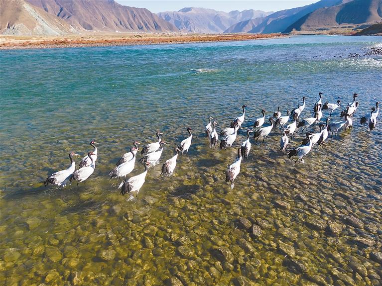 隨著西藏不斷加大黑頸鶴棲息地保護力度,黑頸鶴的生存環(huán)境進一步改善。每年十月中下旬,大批“高原精靈”——黑頸鶴從藏北高原飛到拉薩河谷,它們在農(nóng)田、沼澤地里覓食嬉戲,享受冬日暖陽?!?/p>