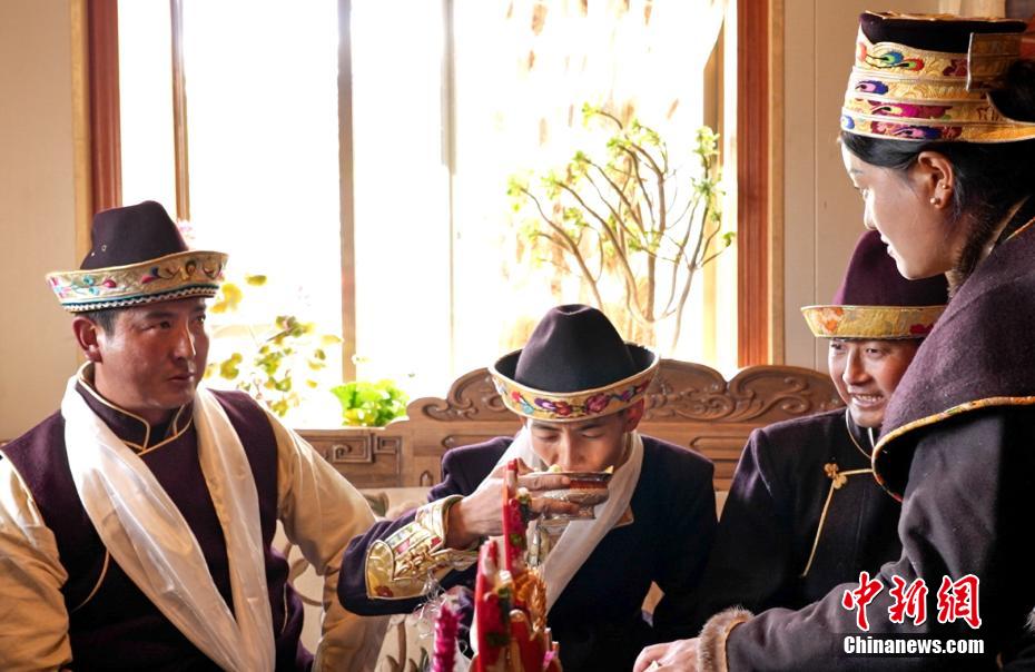11月24日恰逢藏歷十月初一,西藏林芝迎來2023年工布新年,這是西藏最早的新年。工布新年以其悠久的歷史、鮮明的特色、豐富的內(nèi)涵,于2006年被列入第一批西藏自治區(qū)非物質(zhì)文化遺產(chǎn)保護名錄。圖為村民向客人敬酒。 阿仁 攝