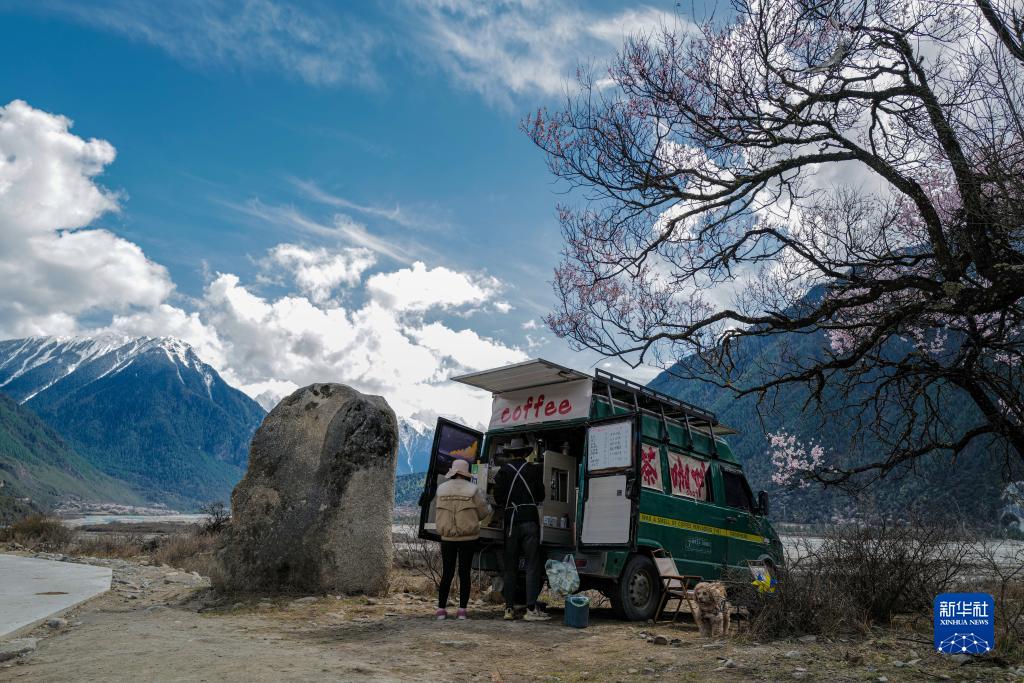 牟宜平和譚艷的咖啡車停在桃花谷中(2023年3月24日攝)。新華社記者 洛卓嘉措 攝