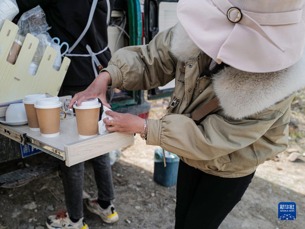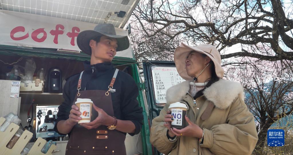 桃花谷中,咖啡車停在桃樹(shù)下,車后遠(yuǎn)處是連綿的雪山。樹(shù)上的桃花被風(fēng)吹落,一朵花瓣剛巧落在還未來(lái)得及封蓋的咖啡里,但顧客對(duì)此并不在意,“這才有林芝春天的感覺(jué)!”他說(shuō)。