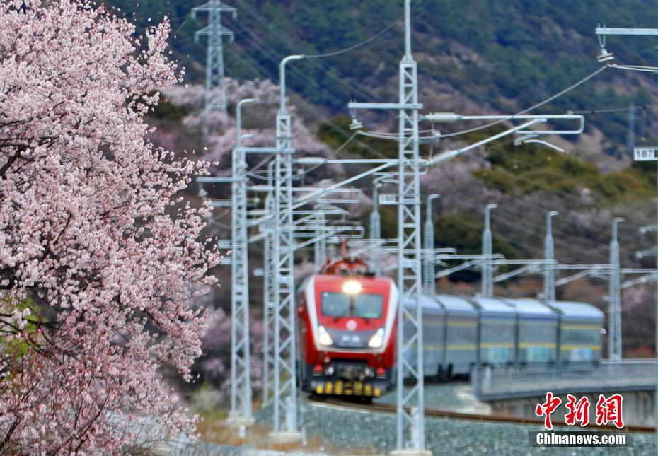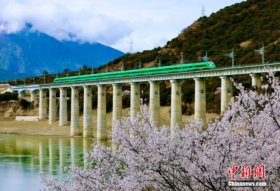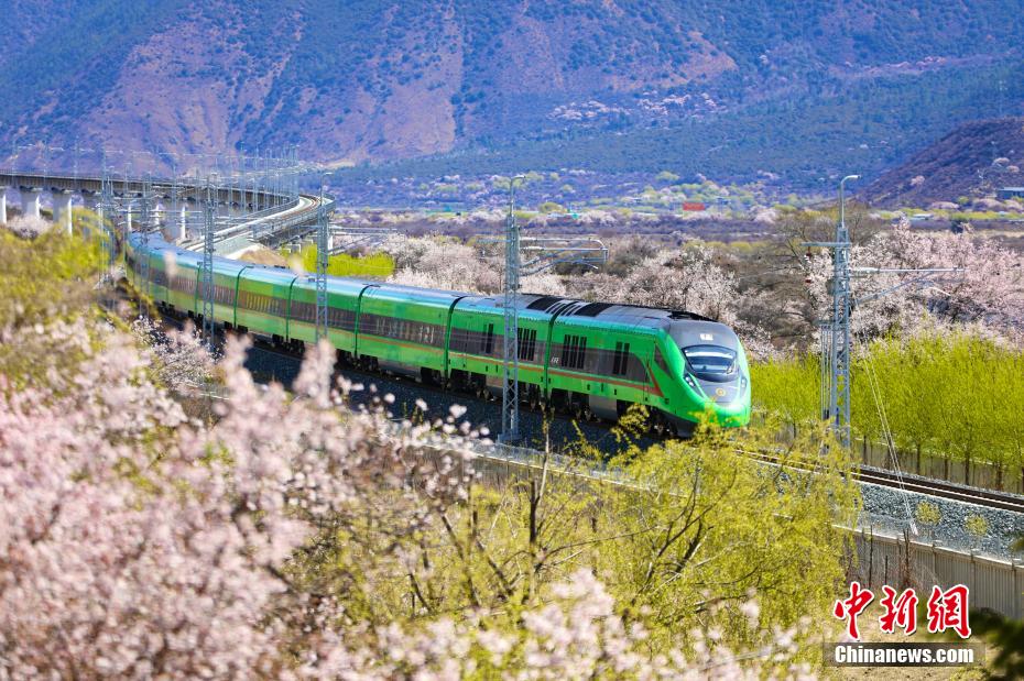 近日,中國鐵路青藏集團有限公司介紹,3月下旬至4月,拉林鐵路沿線綿延的野生桃花林盛開,藍天、白云、桃花、雪山、高原復(fù)興號動車等相互交織,形成了一幅幅美不勝收的畫面。圖為穿梭在桃花林中的拉林鐵路高原復(fù)興號。