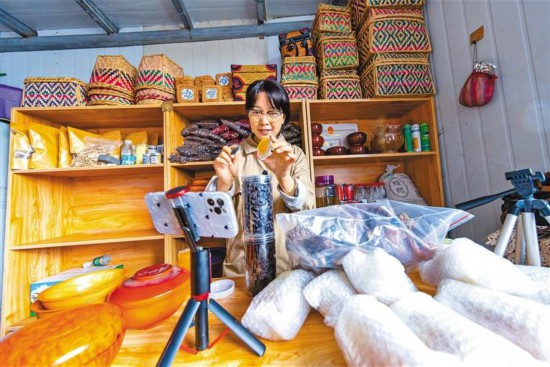 圖為日喀則市吉隆縣吉隆鎮(zhèn)吉甫村村民朗薩通過電商平臺銷售當(dāng)?shù)靥禺a(chǎn)。記者 格桑吉美 攝