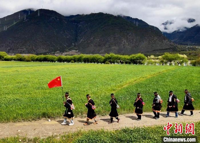 圖為村民背上經(jīng)文繞田?!∴嚢?攝