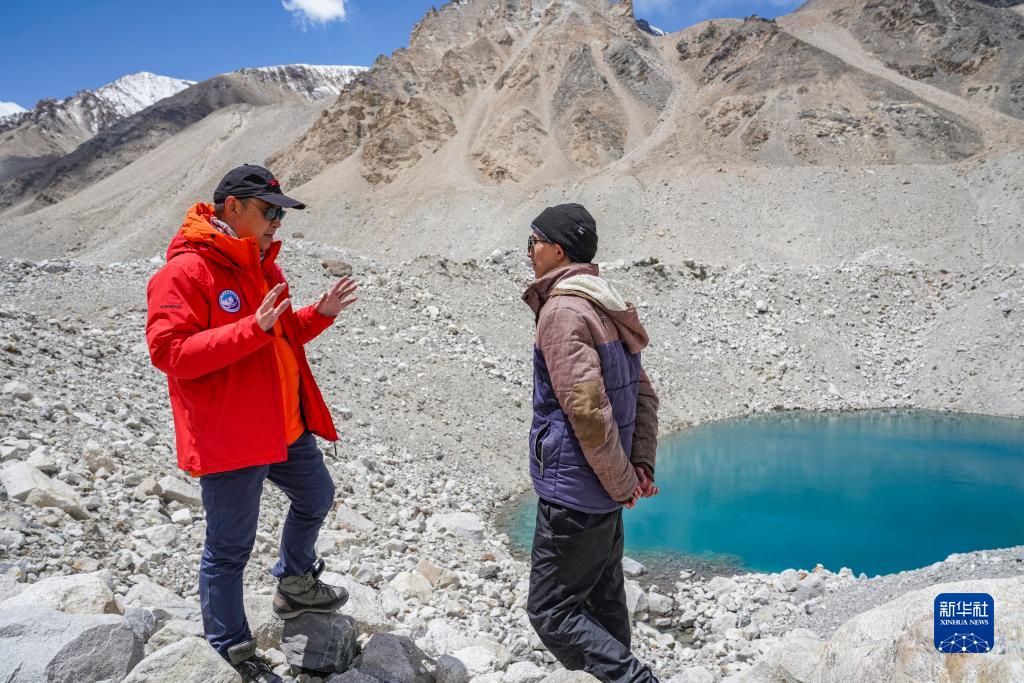 在珠峰海拔約5300米處,科考隊員在探討冰面湖的形成原因(5月14日攝)。新華社記者 孫非 攝