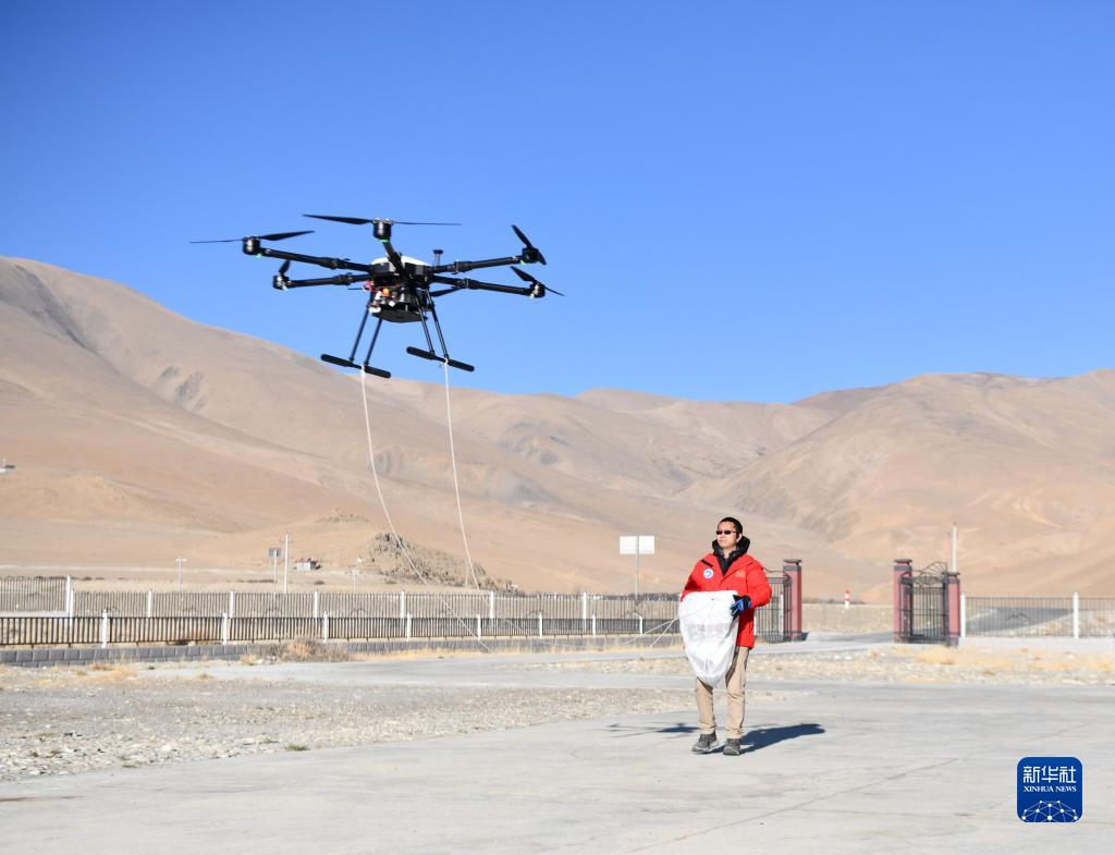 在中國科學院珠穆朗瑪大氣與環(huán)境綜合觀測研究站,科考隊員放飛無人機采集空氣樣本(5月10日攝)。新華社記者 晉美多吉 攝
