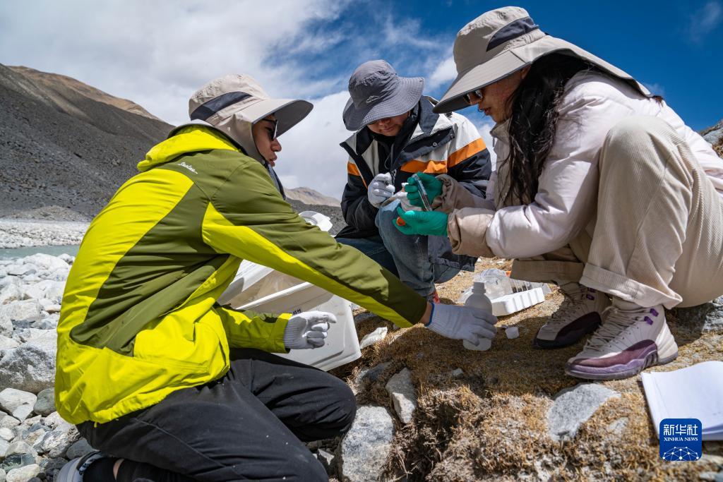 在珠峰登山大本營附近,科考人員檢測絨布冰川末端水質(5月14日攝)。新華社記者 孫非 攝