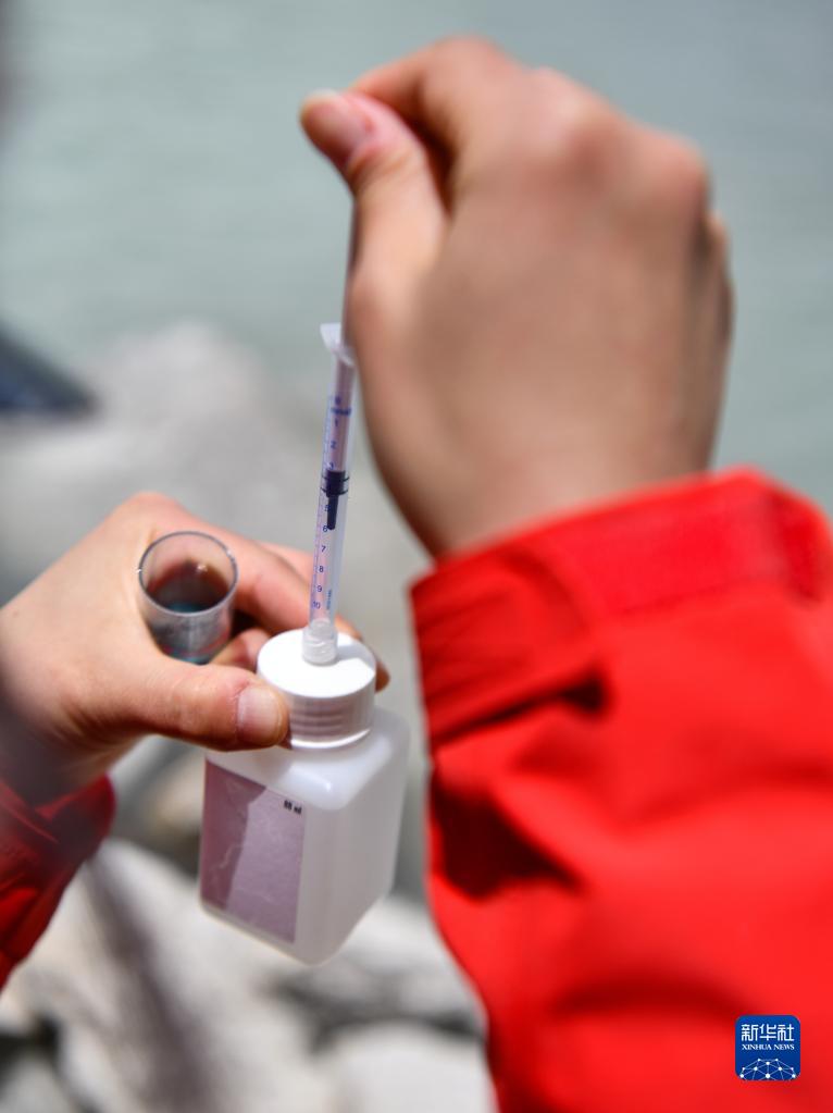在珠峰海拔約5300米處,來(lái)自中國(guó)科學(xué)院青藏高原研究所的科考隊(duì)員邱海英在對(duì)冰前湖水樣滴定碳酸氫根濃度(5月12日攝)。新華社記者 晉美多吉 攝