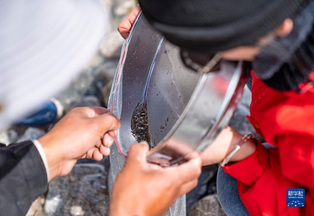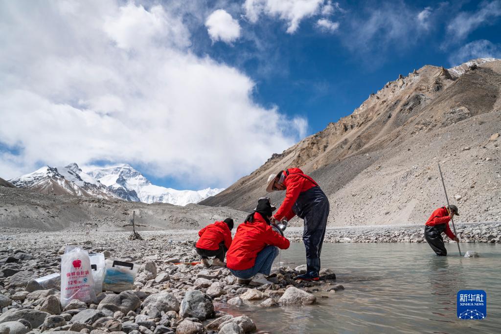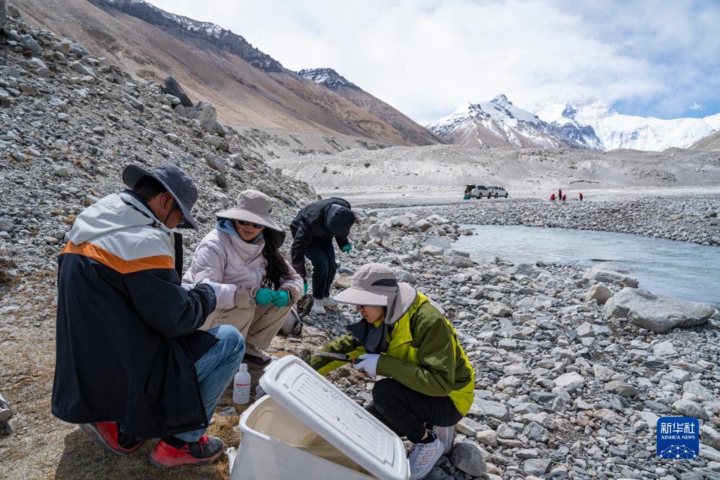 在珠峰登山大本營(yíng)附近,來(lái)自西藏大學(xué)生態(tài)環(huán)境學(xué)院的科考隊(duì)員在收集水生生物樣本(5月22日攝)。新華社記者 孫非 攝