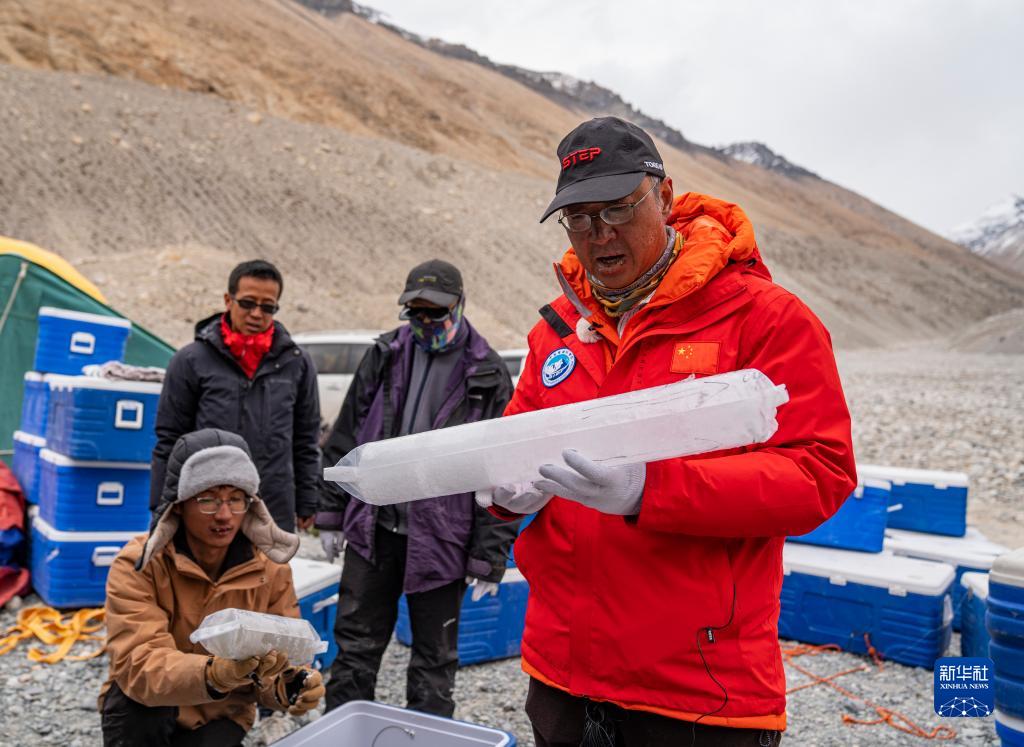 在珠峰登山大本營(yíng),中國(guó)科學(xué)院西北生態(tài)環(huán)境資源研究院副院長(zhǎng)康世昌(右)在查看從珠峰海拔約6500米處鉆取的冰芯樣品(5月22日攝)。新華社記者 孫非 攝