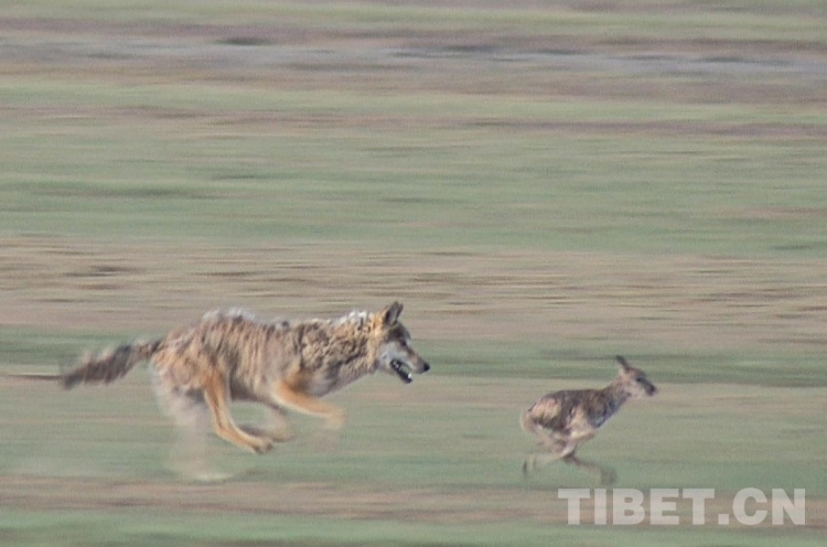 圖為在羌塘自然保護區(qū),野狼正在捕食弱小的藏羚羊。攝影:達瓦次仁