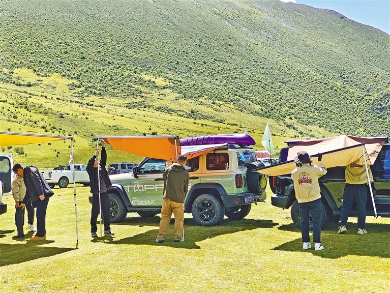 覺丹峰的對面是一大片平整的壩子,在志愿者的引導下,車友們將車輛有序停放好,迫不及待地開始搭設帳篷、側邊天幕等露營裝備。