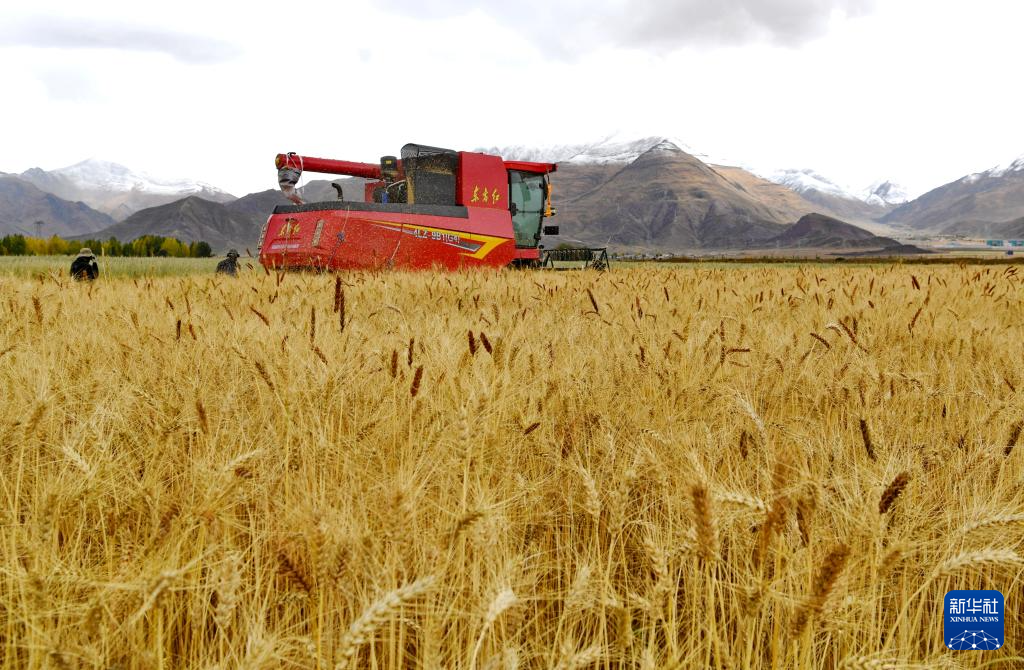 工作人員駕駛農業(yè)機械在西藏拉薩市林周縣曲果強村的高標準農田里收獲小麥(10月12日攝)。新華社記者 張汝鋒 攝