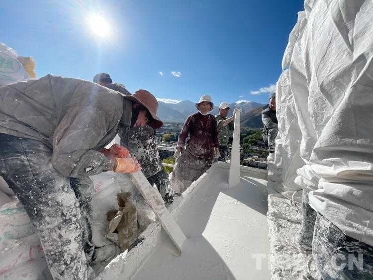 從10月18開始,很多信教群眾和工作人員穿著大褂,或背著裝了白色液體的大桶小桶、或抱著裝了白糖蜂蜜等大袋小袋,紛紛走向布宮的每個角落,加入到粉刷布達拉宮外墻的工作中。