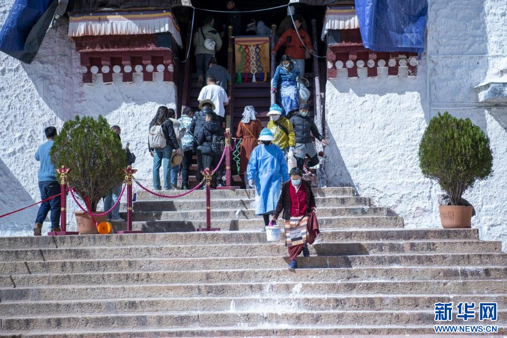 10月18日,布達(dá)拉宮“美容師”們?cè)趪姙⑼鈮?。新華網(wǎng) 柑丹鴦琦 攝