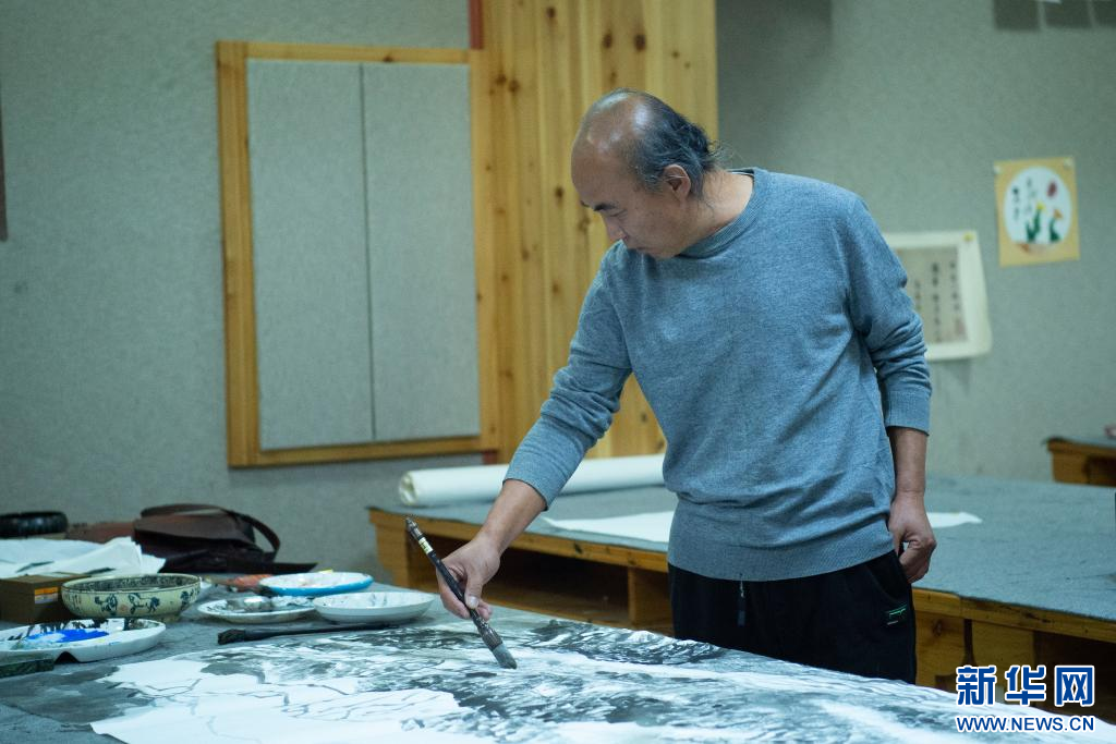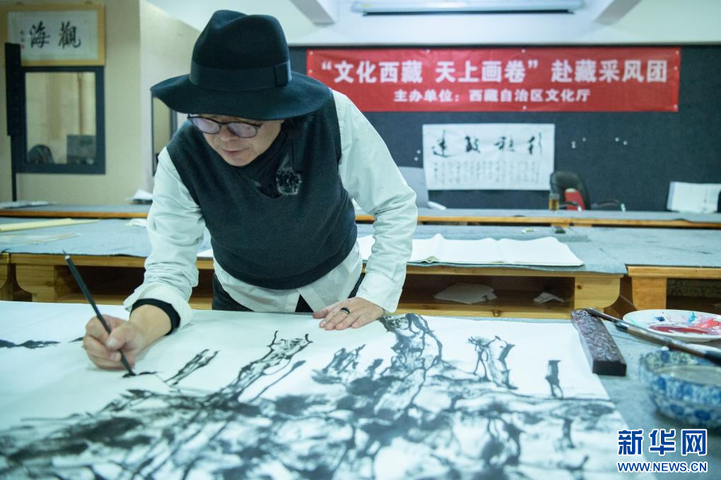 10月16日,畫(huà)家張懷偉在創(chuàng)作。新華網(wǎng) 旦增努布 攝