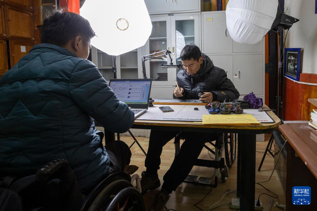 西藏拓崗文化傳播有限公司主播次旦貢嘎(右)與直播助理扎西旺堆在合作直播銷售藏語學習文具(11月10日攝)。新華社記者 姜帆 攝 ??