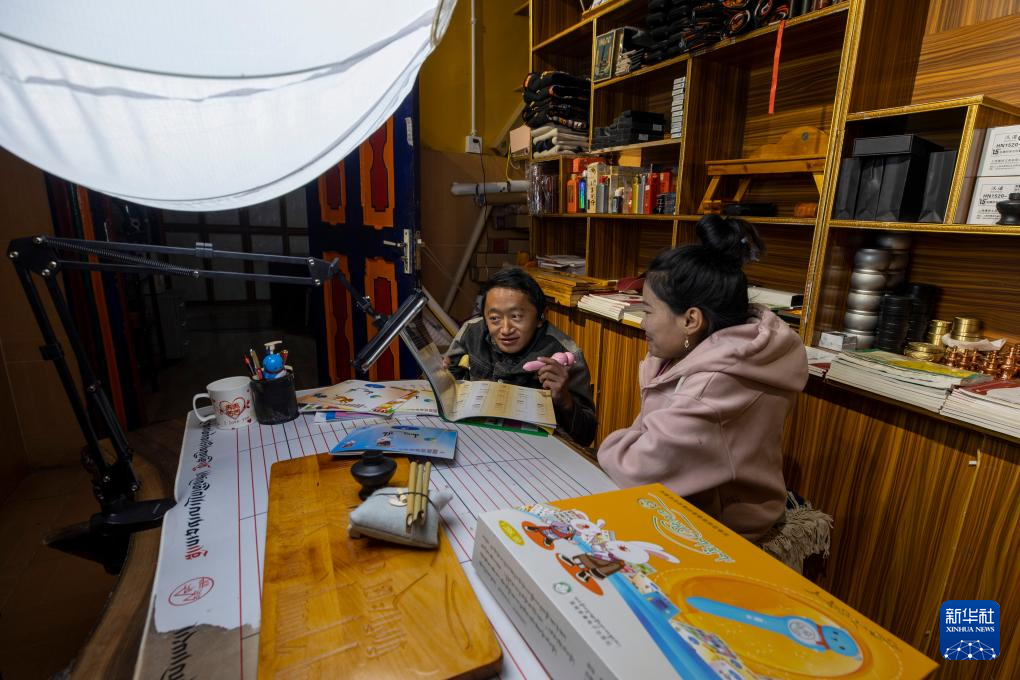 西藏拓崗文化傳播有限公司員工拉巴頓珠(左)與主播索朗德吉合作直播銷售藏語學習文具(11月10日攝)。新華社記者 姜帆 攝 ??