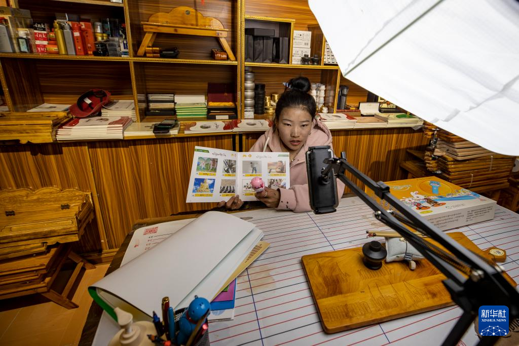 西藏拓崗文化傳播有限公司主播索朗德吉在直播銷售藏語學習文具(11月10日攝)。新華社記者 姜帆 攝
