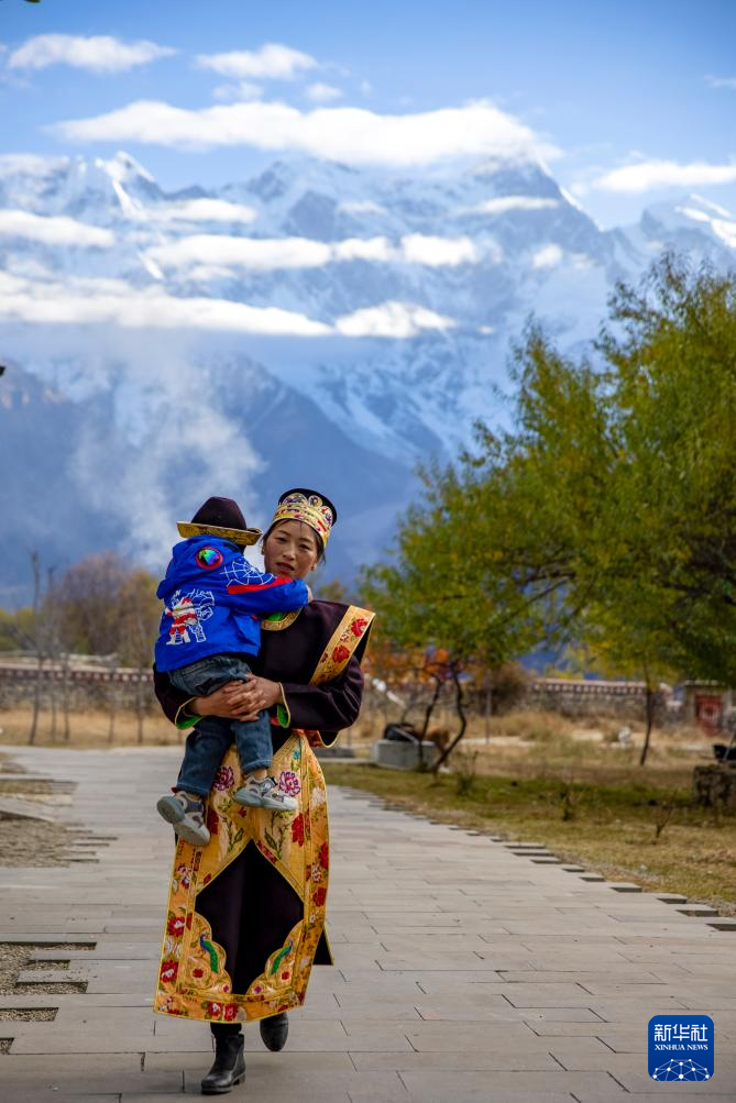工布新年的大年初一,拉巴卓瑪和兒子端著寓意五谷豐登的“切瑪”在家門口祈福(11月14日攝)。新華社記者 姜帆 攝