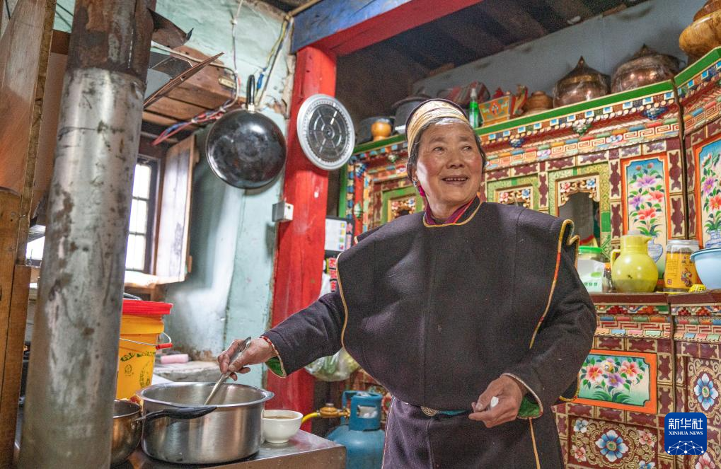 工布新年的大年初一,拉巴卓瑪一早就穿著傳統(tǒng)工布藏裝開(kāi)始忙碌(11月14日攝)。新華社記者 黃耀漫 攝