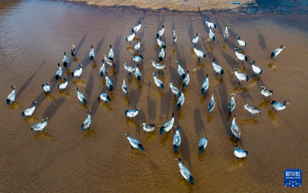 這是12月5日清晨在拉薩市林周縣虎頭山水庫拍攝的越冬黑頸鶴(無人機(jī)照片)。新華社記者 姜帆 攝