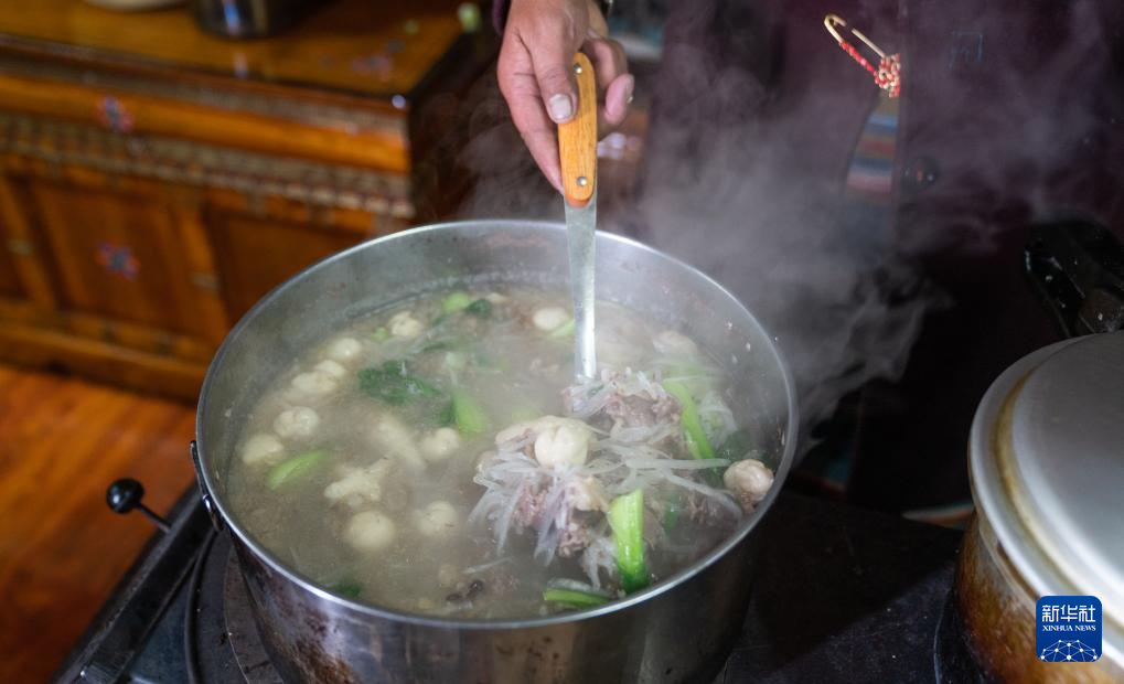 巴桑普尺盛出一碗熱氣騰騰的“古突”(1月10日攝)。新華社發(fā)(普布次仁 攝) ??