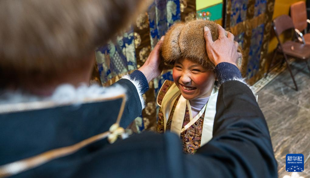 家人為巴桑普尺的孫女益西貴桑佩戴“金花帽”(藏族特色帽子)(1月10日攝)。新華社發(fā)(丁增尼達(dá) 攝) ??