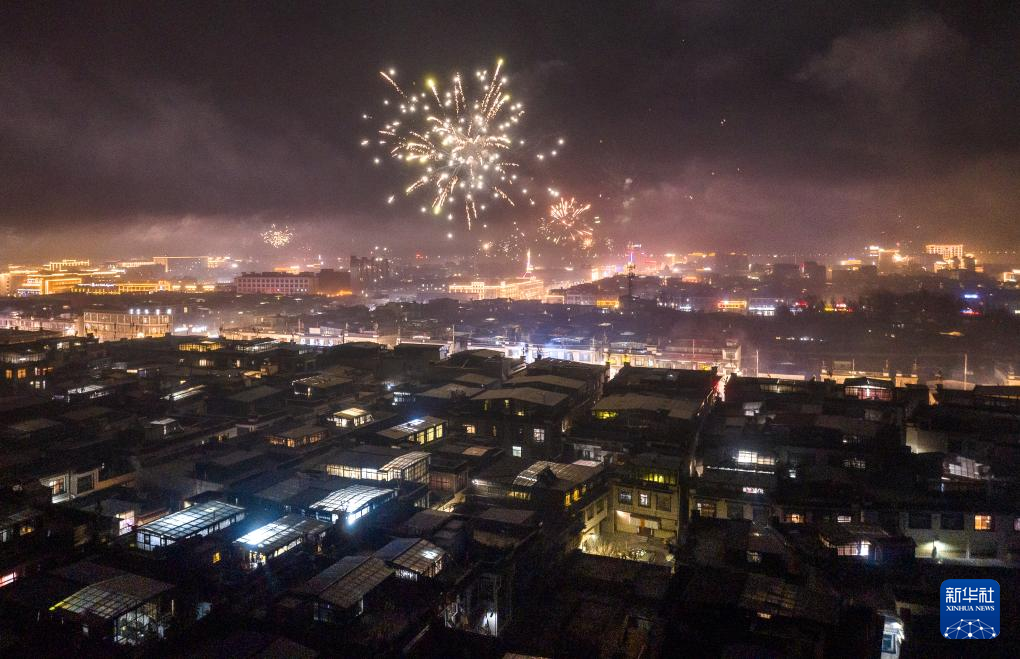 這是日喀則市桑珠孜區(qū)“古突”夜綻放的煙花(1月10日攝,無(wú)人機(jī)照片)。新華社發(fā)(丁增尼達(dá) 攝)