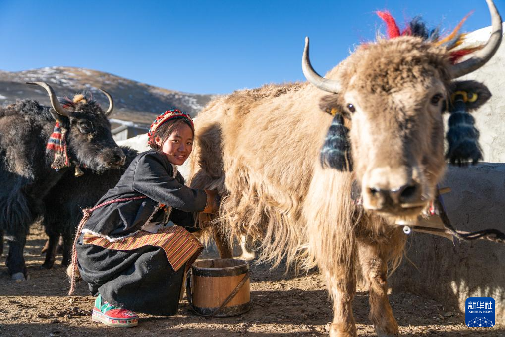 1月13日,時(shí)值西藏日喀則一帶傳統(tǒng)的農(nóng)家新年大年初二。坐落于群山間的日喀則市白朗縣東喜鄉(xiāng)思古龍村,延續(xù)傳統(tǒng)習(xí)俗,舉行擠牛奶、擲牛角等傳統(tǒng)文體比賽和翻桶接力賽等娛樂活動(dòng),以此慶祝新年。