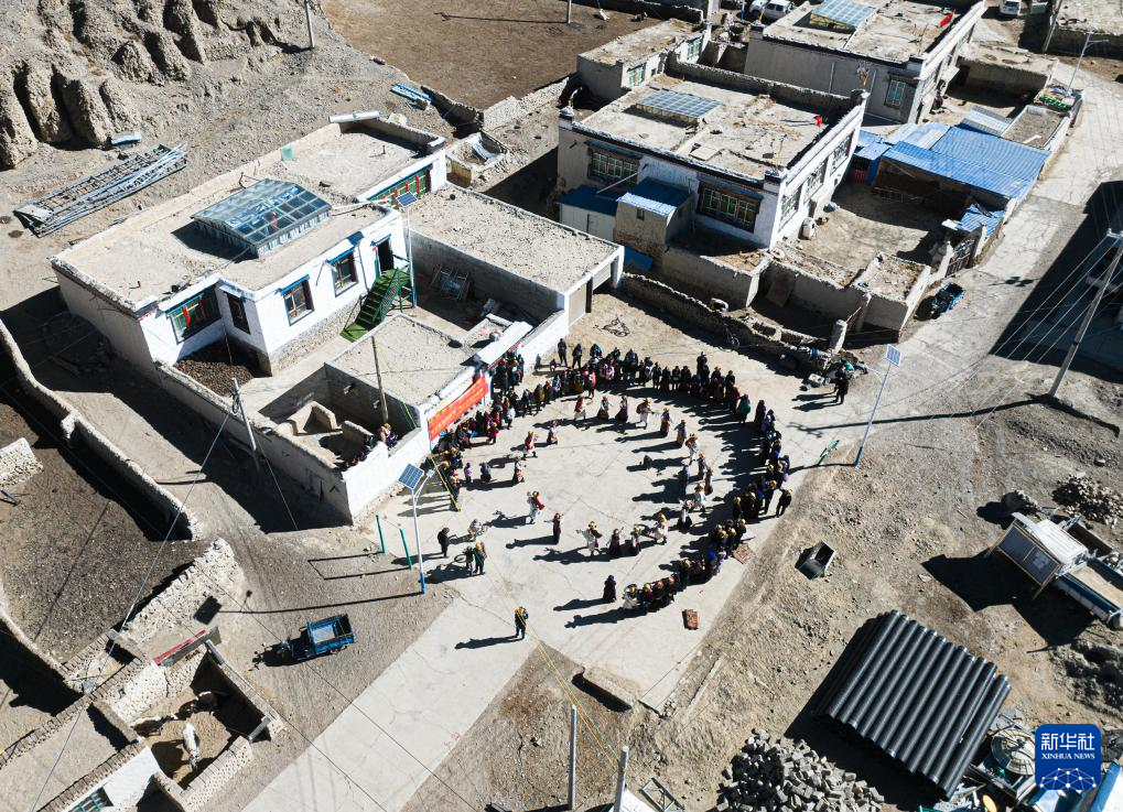 思古龍村的村民們?cè)谔伹f舞(1月13日攝)。新華社發(fā)(丁增尼達(dá) 攝) ??