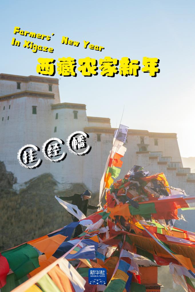 農(nóng)家新年大年初三,日喀則市桑珠孜區(qū)藏族群眾沿襲傳統(tǒng),清晨在山頂和自家屋頂上豎起嶄新的經(jīng)幡,祈愿新的一年國(guó)泰民安(1月14日攝)?! ?/p>